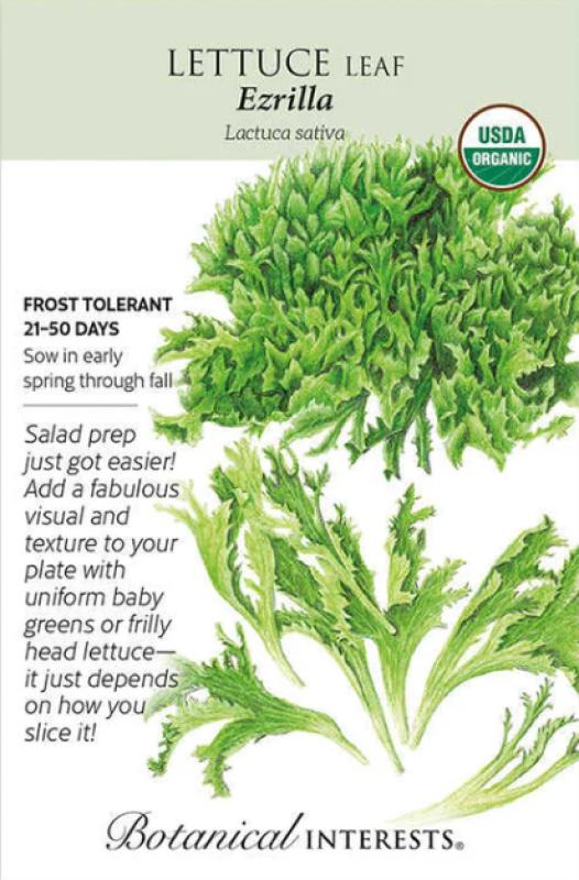 The beauty of 'Ezrilla' is that the leaves grow particularly uniform in short heads with little core. With one cut above the base, same-sized greens fall away for easy salad prep. It is slow to bolt meaning a long harvest, with disease resistance to downy mildew, lettuce leaf aphid, lettuce die-back, and lettuce mosaic virus. Seeds may be pelletized with an organic coating for easy handling.