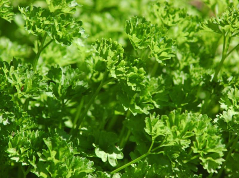 Curly parsley is a variety of parsley (Petroselinum crispum) known for its bright green, tight, and frilly leaves, which make it an ideal garnish due to its decorative appearance and crisp texture. It has a fresh, herbaceous, and slightly bitter flavor, and is also used in cooking to enhance dishes like meatballs or white clam sauce. While its primary use is as a visual element, it contains high levels of chlorophyll, vitamins A, C, and E, and can be dried or frozen for longer use.