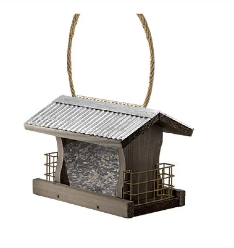 Crafted with a weathered, rustic finish and realistic farmhouse details, it features a central seed compartment flanked by two suet cake holders — perfect for offering mixed seed and high-energy suet all in one feeder. Clear window panels make it easy to monitor seed levels, and the wide feeding platform provides perching space for multiple birds at once.
