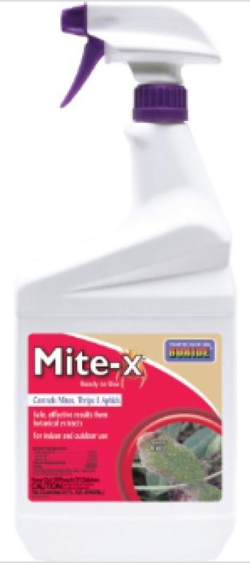Mite-X kills mites safely on all plants. To use, spray directly onto plants. It can be used on vegetables, fruit, nuts, vine crops, shrubs, berries, herbs, spices, ornamentals, evergreens, greenhouse plants and interior plants. It offers a pleasant odor and is safe for use around children and plants and can be used on indoor or outdoor plants to kills mites, thrips, and aphids. It is made from botanical extracts and plants and plant extracts