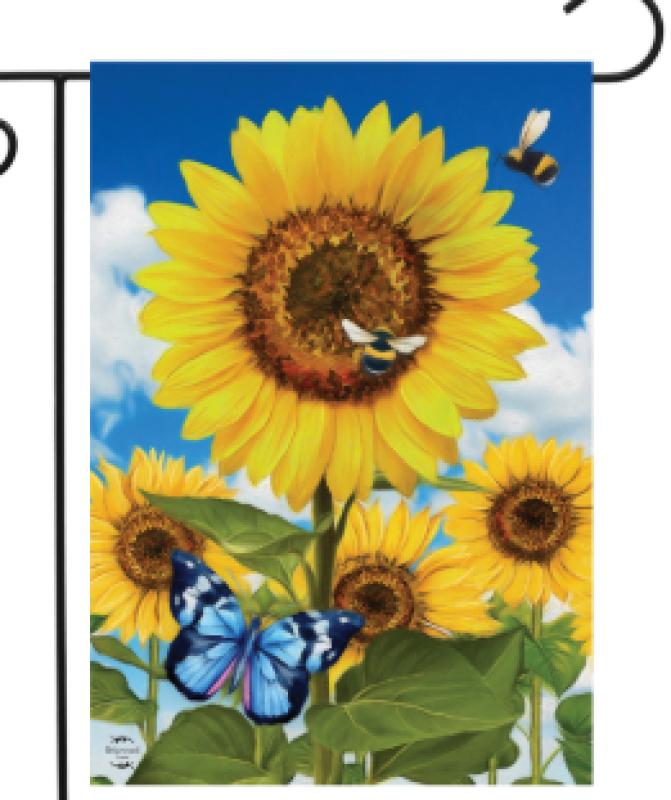 Add a colorful, welcoming touch of the season with this sunflowers and bees garden flag. The original artwork is printed on a polyester material designed for outdoor display, and provides a unique design that is as durable as beautiful! Flag stand sold separately Size: 12.5" x 18.