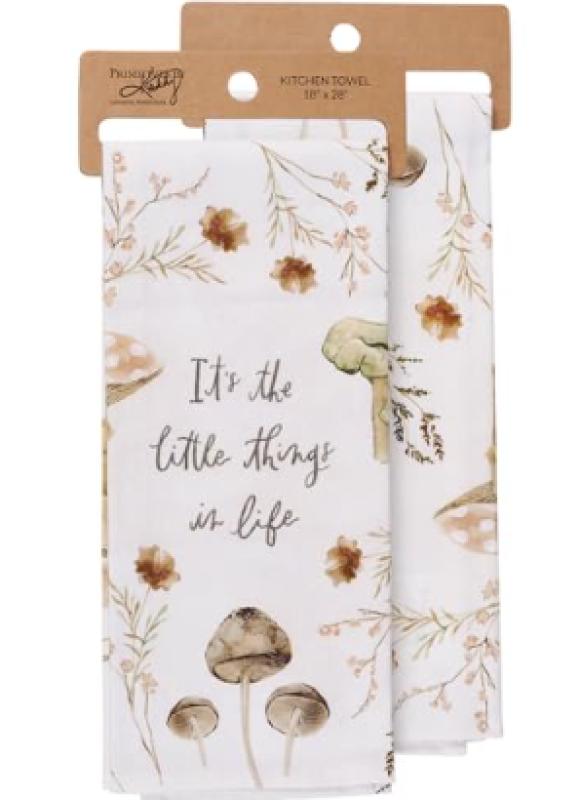 A cotton kitchen towel from our Cottagecore Collection displaying an all-over design of mushrooms and flowers surrounding an inspirational sentiment that reads "It's The Little Things In Life." Our Little Things kitchen towel is conveniently machine-washable for easy cleaning. Packaged on a cardboard hanger with hole to easily display on rack. A rustic nature-themed kitchen accessory perfect for everyday use.