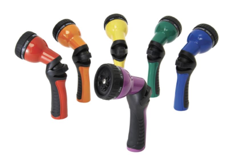 Equipped with 1 touch valve to control water flow. Quick change feature allows for easy switching between the 9 spray patterns. Assortment includes: red, orange, yellow, green, blue, and berry.