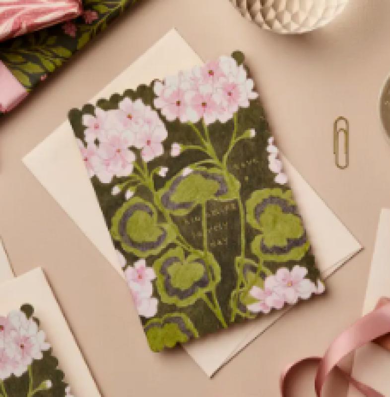 This little card has been created from an original gouache painting of a zonal geranium, and features a die cut scalloped edge. A delicate golden foil greeting reads 'have a blooming lovely day'. This card is paired with a luxury blush pink envelope.