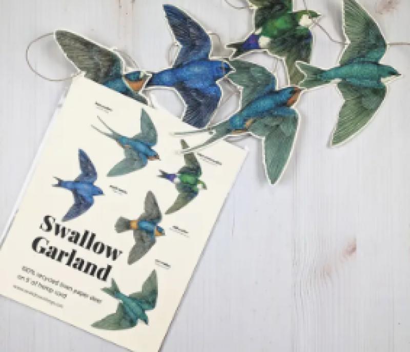 This 5' garland is made up of original watercolor, gouache and pencil illustrations. It features five swooping swallow drawings. Each colorful bird measures about 6" wide and is printed on 100% recycled linen paper, and strung on eco friendly hemp cord. It is packaged in a compostable plant-based sleeve with an 8x10" white backing board.