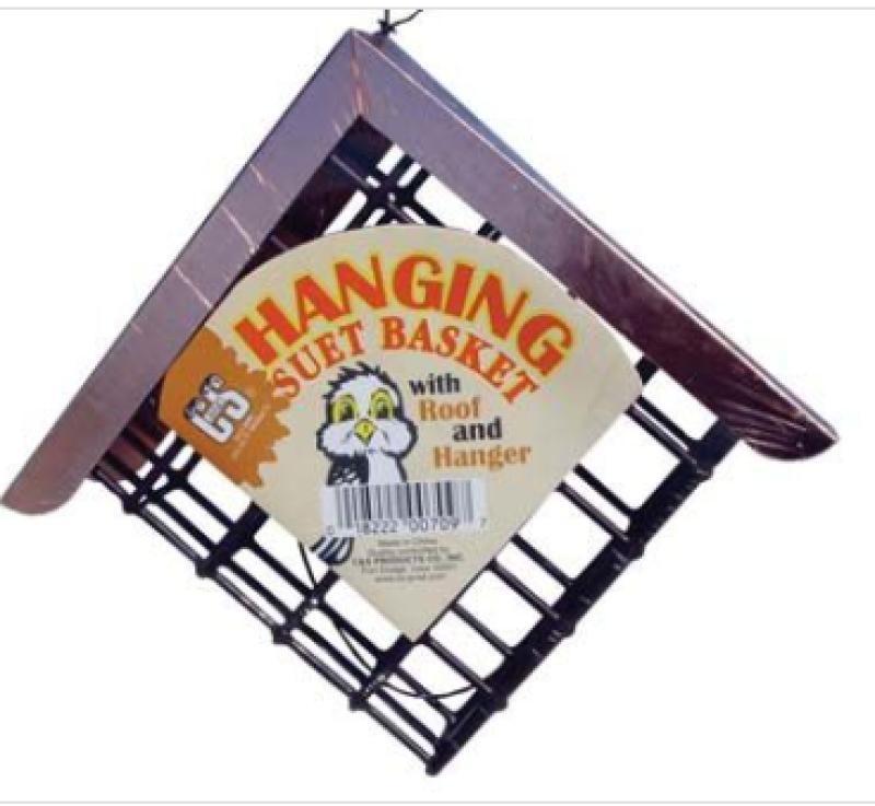 Constructed of vinyl coated wire with copper top.For wild bird suet feeding.Fill basket with wild bird suet and hang outdoors.Special basket with roof to keep rain out and hanger included.Holds 1 suet cake