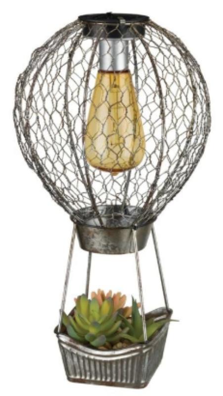 Trendy faux succulents accentuate this fun decorative tabletop piece. Built with country chicken wire galvanized metal and an amber colored solar Edison Bulb that lights that lights up the Balloon at night. Edison Bulb 6-8 hours of continuous light at night Replaceable rechargeable batteries Waterproof solar panels Weather & fade resistant paint.