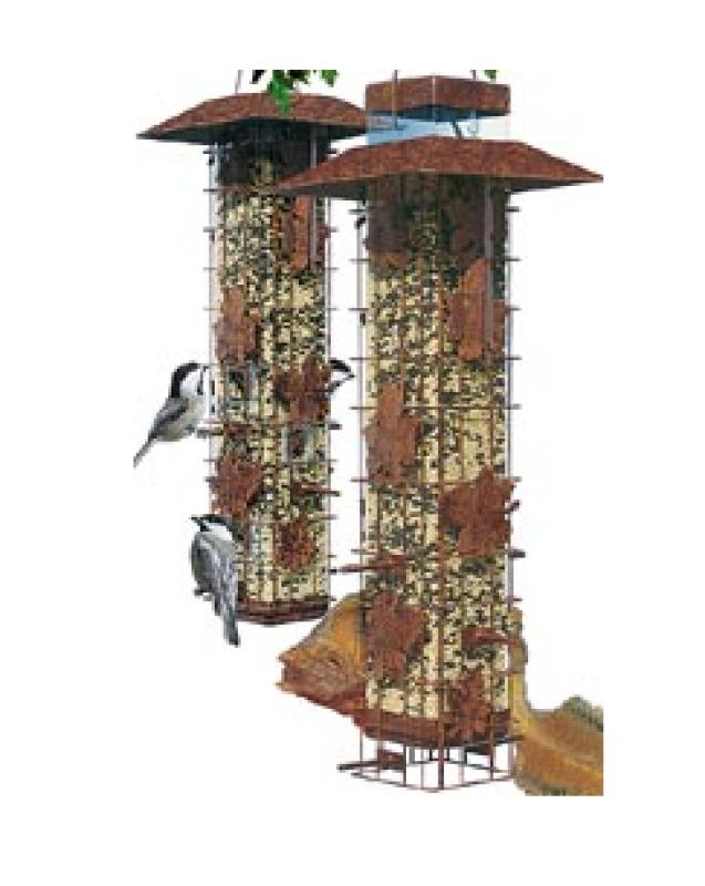 6 station bird feeder, ports close when squirrels come to feed. Rustic leaf design with a 2 Lb. mixed seed capacity.