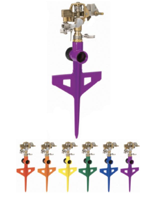 Uses all brass impulse sprinkler head on a 6" heavy-duty metal stake. This handy impulse sprinkler, with step-in 6" stake has adjustable partial and full circle patterns, with water coverage up to 70 ft. in diameter. The eye-catching 6 colors and design of the ColorStorm stake impulse sprinkler makes a stylish and functional tool in your yard. Lifetime guarantee to the consumer.