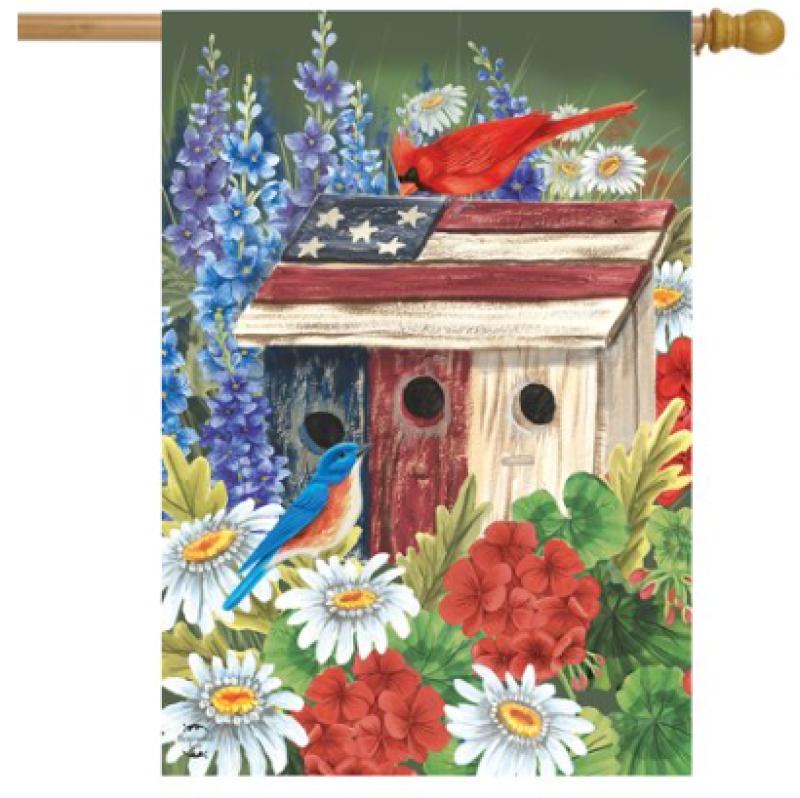 This Patriotic Gathering Spring House Flag measures 28 x 40, Artwork is printed on polyester material designed for outdoor display. Artwork is correctly readable on one side.