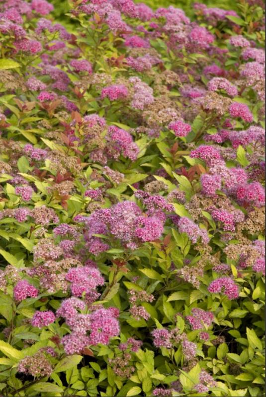 A neat, compact, mounded shrub with vibrant red new leaves. Clusters of small pink flowers contrast with bright gold mature foliage that turns rich russet red in fall. This extraordinary combination of colors will brighten and enhance any landscape