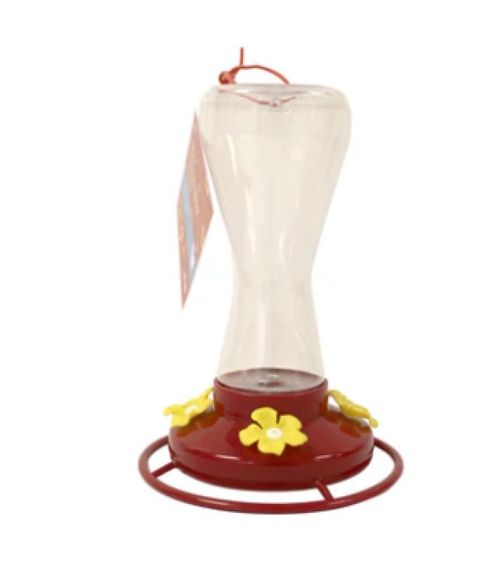 Heath's Hummingbird feeder holds up to 18 ounces of nectar and has 4 feeding ports. A full perch ring allows multiple birds to land. It's easy to fill and clean and the wire hanger is included.