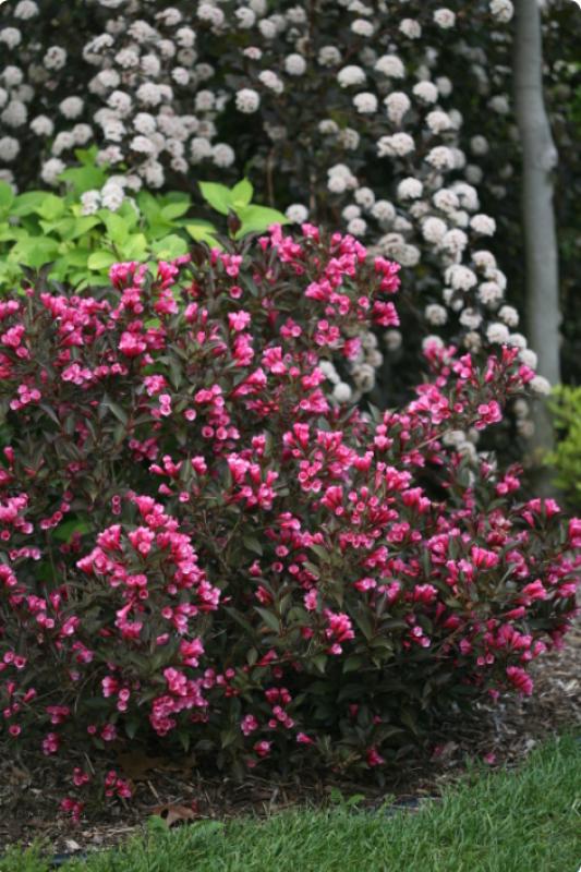 Rosy pink flowers appear in late spring and often rebloom in summer. Rich dark purple foliage all summer. Season long color. Deer resistant. Attracts hummingbirds.