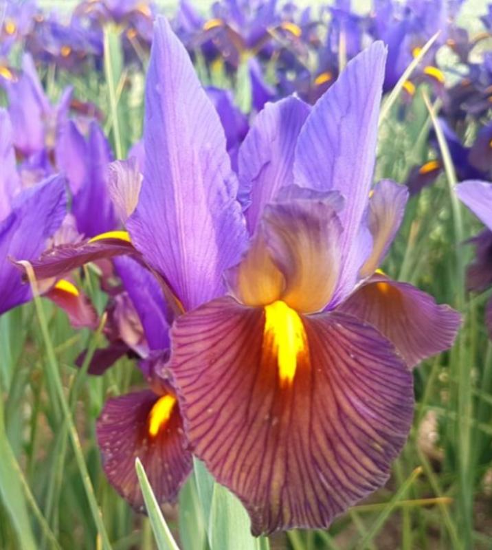 Iris hollandica Eye of the Tiger. Uniquely colored, this exotic "Beauty" strain has violet-blue standards and sultry, mahogany-bronze falls with yellow blotches. In the 1940s, the De Graaf Brothers and S.A. van Konijnenburg hybridized the award-winning "Beauty" strain of Iris hollandica. These magnificent varieties are characterized by glorious ephemeral colors, larger flowers and often the growth of a second flowering stem.