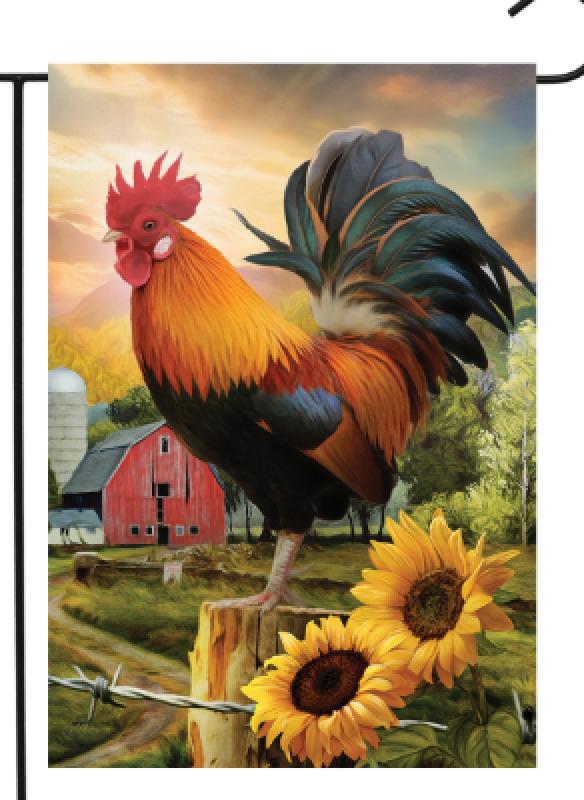Briarwood Lane's fancy rooster garden flag adds a colorful, welcoming touch of the season to your home and garden. The original artwork printed on a polyester material for outdoor displays provides a unique design that is as durable as beautiful! Measures 12.5" x 18" Flag stands are sold separately.