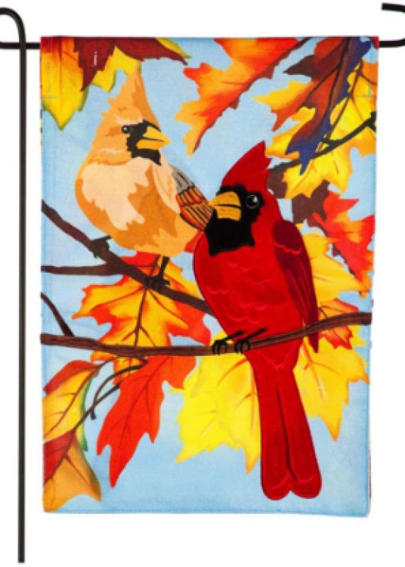 This Cardinal Couple Garden Burlap Flag is perfect for adding fall colors to your outdoor space. In this scenic design, a male and female cardinal rest on an autumn leaf-covered branch. Greet family and loved ones with this elegant garden flag that is sure to bring some fall cheer. This flag is made of medium-weight, soft polyester burlap fabric that has the look and feel of real burlap. Artwork is heat transferred onto both sides of the textured fabric to create a natural, crafted look. The poly-burlap is a durable and weatherproof material that will not fade or fray after continued display. This flag features a sleeve for use with any standard flagpole or stand, sold separately.