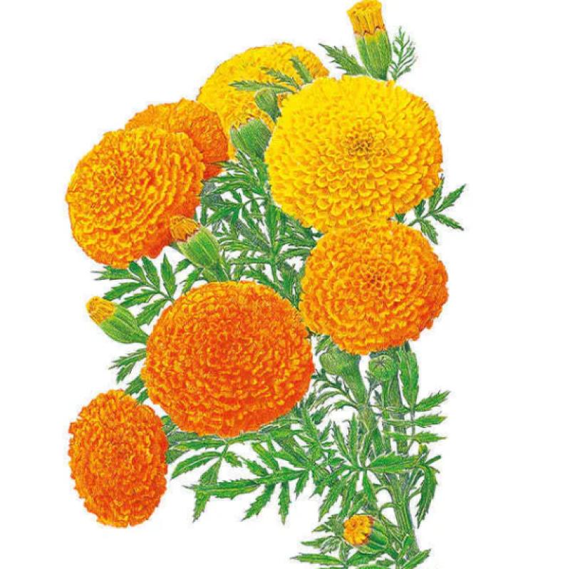 If you want a large, majestic marigold, Crackerjack is a superior blend with a mounding form, consistent height, and sturdy flower stalks. The 4" blooms in tangerine orange, rich gold, and lemony yellow will brighten up your flower bed, path edges, and large container plantings. They make radiant, long-lasting cut flowers and are so easy to grow from seed. African Marigold petals are edible with a slightly bitter, citrusy/spice flavor. They make a pretty garnish on rice, salads, or desserts.