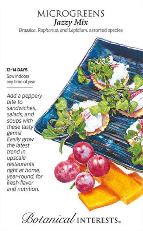 The varieties in this custom mix will all be the perfect 1"–2" size at the same time, with an appealing flavor and texture combination as well as a beautiful color presentation. Nutritious microgreens can be grown at any time of the year, and are a nutrient-packed way to get your "green fix" in the dead of winter. Move containers as needed for best light exposure and temperature (65°–75°F). Jazzy Mix microgreens are ready to harvest in about 12 to 14 days after sowing, when they have cotyledons (first leaves), or when the first true leaves (second set of leaves) have begun to form, depending on preference.