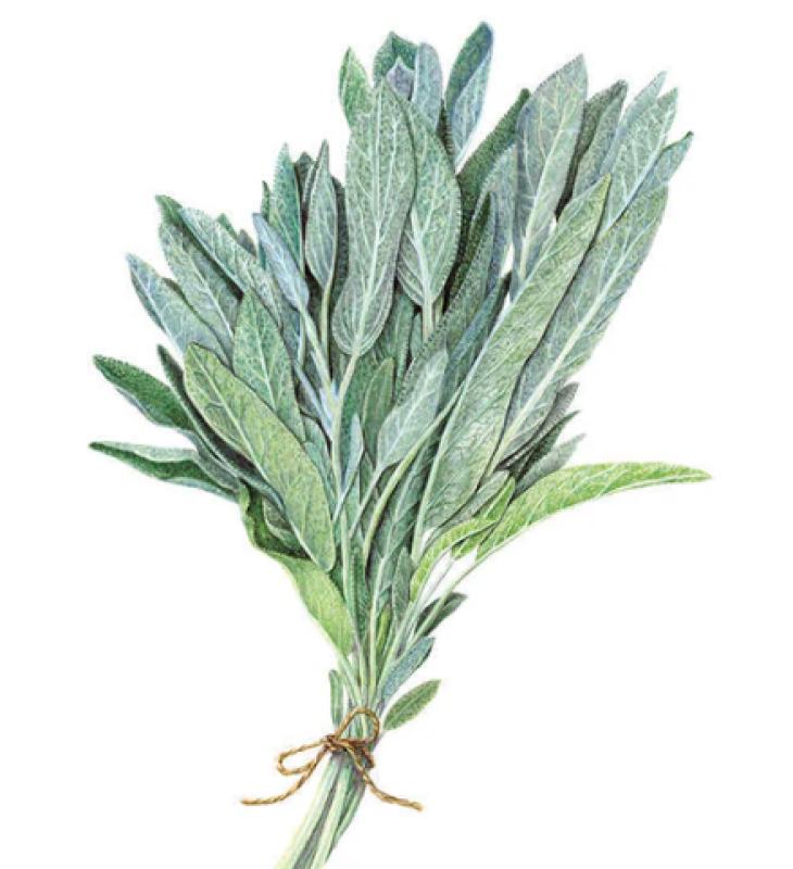 Sage's flavor is bold and assertive, and considered very valuable as a digestive aid to high-fat foods, such as pork, wild game, and cheese. Often paired with stuffing, it also livens up vegetables, potatoes, soups, and stews. This drought-tolerant plant also has edible, purple-blue flowers that attract pollinators, and the gray-green foliage provides an excellent contrast in the garden or containers.
