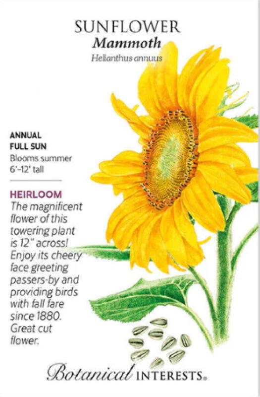 Mammoth Sunflower is a towering annual that produces enormous, bright yellow blooms with rich brown centers, perfect for dramatic garden displays or cutting. Its tall, sturdy stems thrive in full sun and well-drained soil, supporting massive flowers that can reach impressive sizes. Beyond their striking appearance, these sunflowers attract pollinators and can provide edible seeds for snacking or bird feed.