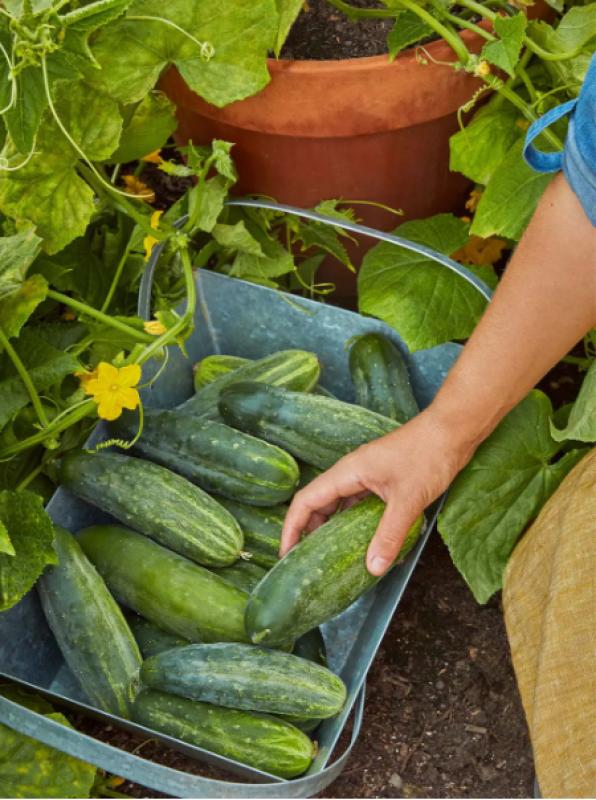 This compact cucumber is ideal for containers or hanging baskets. Its short, hardy vines produce slender, dark green fruits 7 1/2" long. Its prolific and great in salads or plain. Resistant to Cucumber mosaic virus and scab.