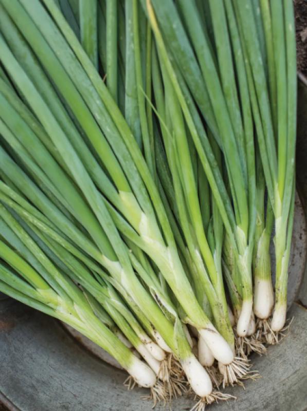 Heirloom bunching green onion’s clusters of long, slender 12–14" white-fleshed stalks with “spring green” tips are marvels of crisp, mild flavor. Indispensable for salads, soups, pasta, and fish dishes. Excellent stir-fried with ginger and chile, or simply braised with butter. Sow a new crop every two weeks through the season and overwinter for a springtime harvest. Very cold-hardy, disease-resistant.