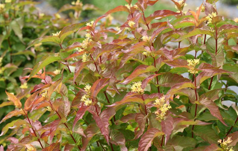 This shrub pushes fall color to the limits with its glowing orange fall foliage. It lights up the fall landscape, making it an ecofriendly alternative to burning bush. Bright yellow flowers in early summer add to its appeal. A durable native plant that thrives in sun or shade, its is drought-tolerant, deer-resistant, and can even grow in dry shade. This is an excellent landscape plant that will succeed in even challenging sites.