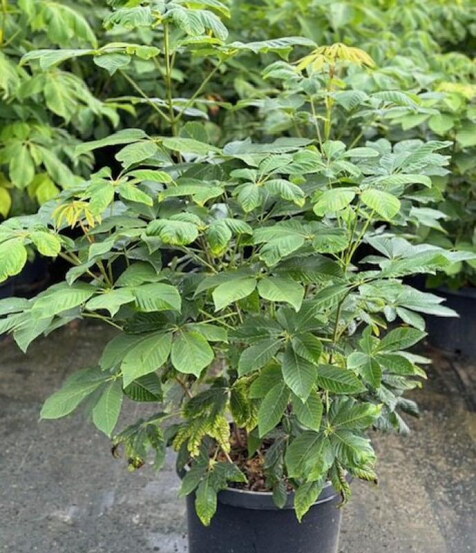 Dense, mounded, multi-stemmed deciduous shrub that can grow in anything from full sun to full shade! Palmate leaves emerge a pretty bronze color, aging to green with brilliant yellow fall color. Interesting blooms of white flower panicles with red anthers and pink filaments appear for weeks, lasting from early- to mid-summer. This is considered one of the BEST flowering shrubs for shady areas. Practically pest-free and deer and rabbit resistant. A butterfly and hummingbird magnet!