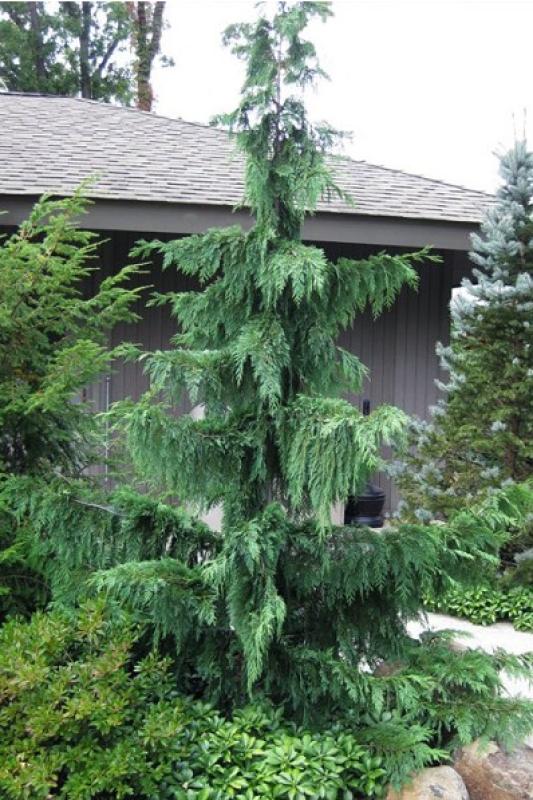 Chamaecyparis nootkatensis 'Glauca Pendula', commonly called Blue Weeping Nootka Cypress, is an older cultivar discovered and introduced way back in the mid 1800s. It has stood the test of time and graced many a landscape for good reasons. Highly ornamental and dramatic, its gracefully pendulous branches are clothed in feathery sprays of delightful blue-green foliage.