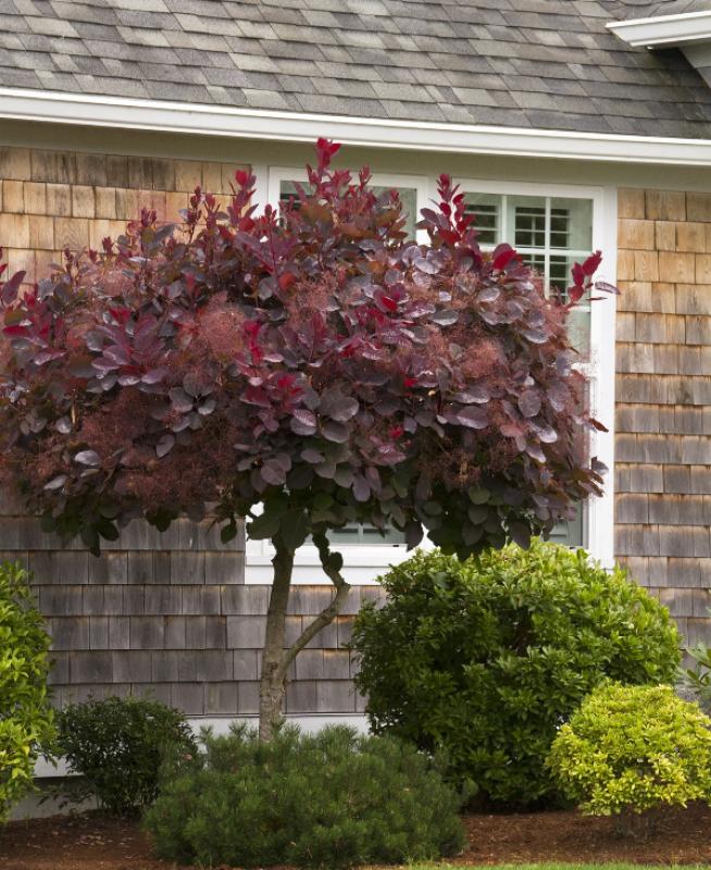 Dramatic, long-lasting, pinkish purple, smoke-like airy seed clusters backed by reddish purple foliage create a prized small tree or large accent shrub. Foliage holds its color all summer, then turns scarlet red in autumn.