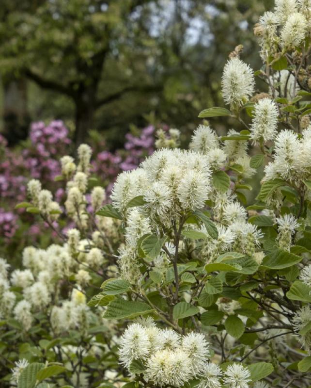 A deciduous shrub with deep blue-green leaves that have spectacular range of fall color. Showy, honey-scented, bottlebrush-like, white flowers appear before foliage emerges in spring. A beautiful addition to the landscape in semi-shaded mixed shrub borders, or as a background shrub, or hedge plant.