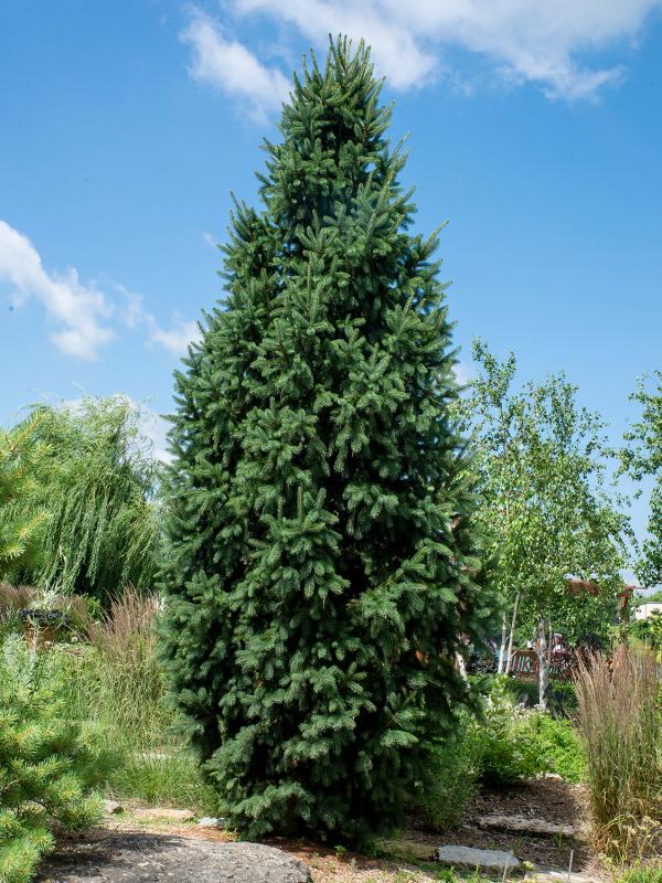 Elegant columnar selection, highly valued as an accent or perimeter planting where a strong vertical effect is needed. Dark green evergreen needles are slightly curved on closely set limbs, creating a slender, uniform form with dense branching to the ground. Withstands heavy snow loads. Tolerates heat and humidity better than others. Ideal windbreak or privacy wall.