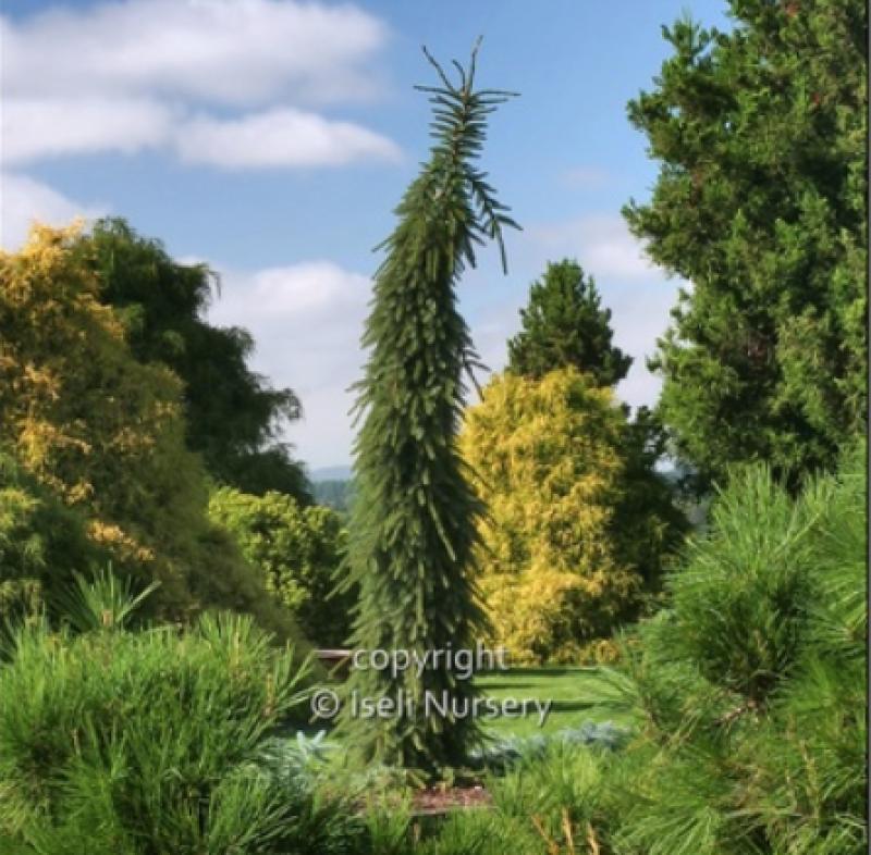 A spire-like focal point has the narrowest silhouette of all the large, upright Serbian Spruce cultivars. Its strictly weeping branches boast two-tone needles that are deep, greenish blue on top and silvery beneath.