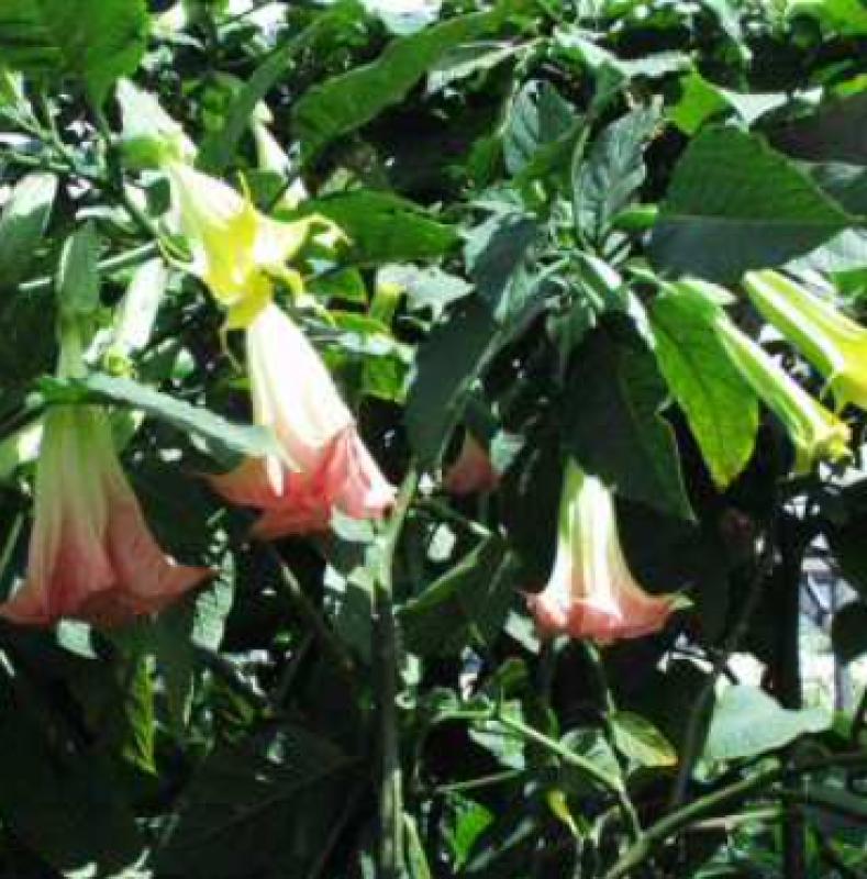 Brugmansia x insignis (Pink Angel's Trumpet) - Evergreen shrub/tree that grows to 8 to 12 feet tall by 6-10 feet wide with long flared pink flowers summer-fall. This hybrid is a cross between Brugmansia suaveolens and a hybrid of B. suaveolens and B. versicolor. Its large widely-flared pale pink flowers hang downwards and darken with age. The flowers are accentuated by the large dark green leaves. It benefits from a hard cut back in the spring. Will take sun or shade, moderate water. Although it is hardy to about 20-25 degrees F, it usually will go semi-deciduous in the winter and have some down time then.