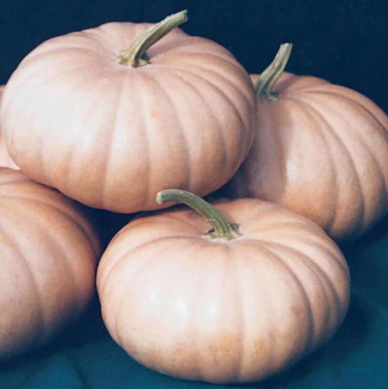 Medium-large, flattened, medium-ribbed, suggesting a wheel of cheese. Smooth, tan skin, slender woody stem. Deep orange, moderately sweet flesh for pie. Long storage. A beautiful oldie. Avg. 6–10 lb.