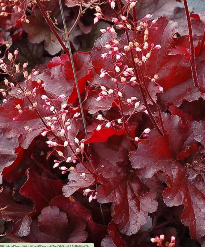 Smoky burgundy-red ruffled foliage remains consistent in color but exhibits its deepest red hues in the spring and fall. Red stems that echo the foliage color support creamy-white flowers that open from pink buds. From the ForeverĀ® series, Heuchera Forever Red flaunts dazzling foliage color, texture, and shape. Vigorous and bearing many dainty flowers, Coral Bells make excellent border plants with their neat clumps of evergreen foliage.