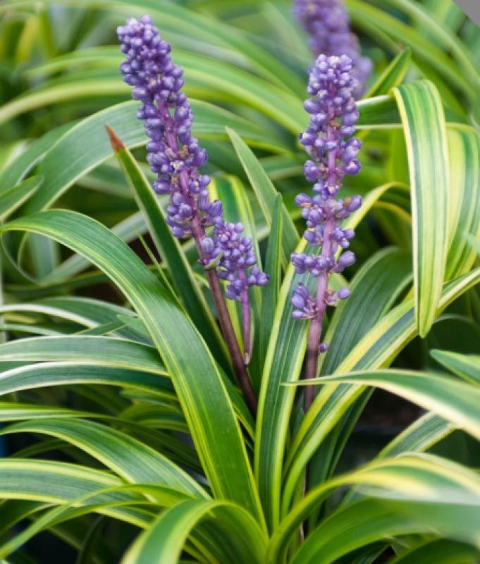 Brighten shady corners with the graceful, arching foliage of Liriope muscari 'Variegata.' Each finely edged blade, striped in creamy white, brings a touch of light and contrast to garden beds, borders, and pathways. In late summer, soft lavender flower spikes—resembling Grape Hyacinths—rise above the leaves, followed by shiny, black berries that linger into winter. Evergreen in milder regions, this dependable, clump-forming perennial provides year-round interest. Use it to create soft drifts beneath shrubs, define paths, or add brightness to shaded foundations. Whether used as a ground cover or edging plant, 'Variegata' weaves effortlessly through the garden with low-maintenance charm.