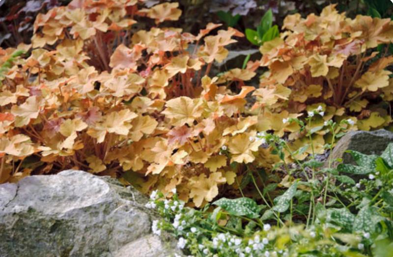Heuchera ‘Caramel’ has developed a reputation with gardeners for its excellent habit, interesting color, and durability. Throughout our trial this reputation proved well-deserved. Fuzzy, peach colored leaves emerge in spring and slowly age to a pale orange-yellow. When grown under more sunlight the color can become increasingly yellow.