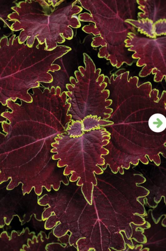 Deep Burgundy to Chocolate foliage with a ruffled edge outlined in chartreuse with well-branched plants. Sun to shade tolerant and great in both landscapes and containers. It is late to bloom, which helps preserve the foliage presentation throughout the season.