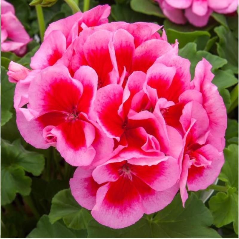 Characteristics such as heat loving, drought tolerant, large semi-double flowers, extremely well branched and vigorous make Calliope the new standard for geraniums. Calliope Rose Mega Splash features large vibrant pink flowers with deep hot pink centers that work equally well in the landscape and baskets or containers.