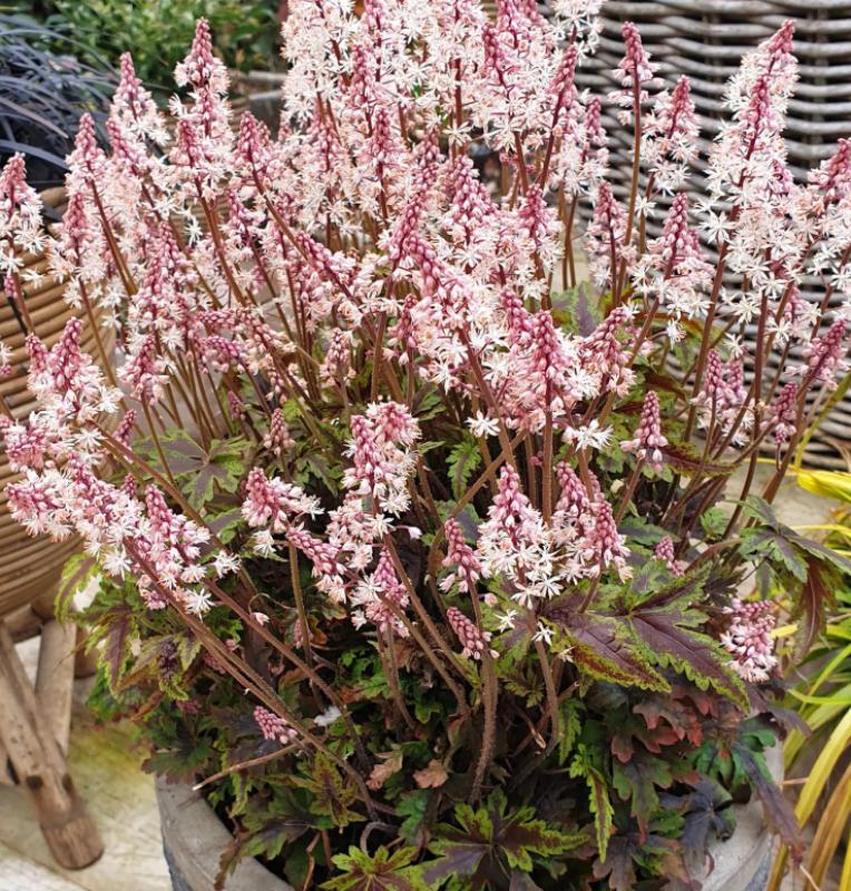 Rosettes of large deeply incised foliage gives the look of feathery wings. Each green leaf is imprinted with striking dark maroon. Upright spires of pink buds open to fluffy white flowers. Although it prefers part shade, this variety is celebrated for its excellent heat tolerance. Tiarella Angel Wings parades an abundance of flowers from April to June and again in September to October. Foamflower can be mass planted to form an attractive band of color.
