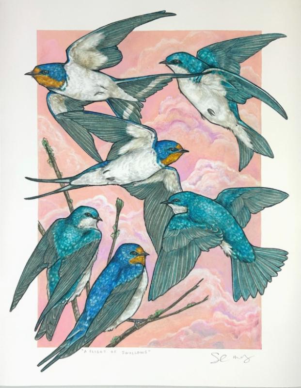 The collective noun for a group of swallows is a flight. These barn swallows and tree swallows are swooping in front of a pink sunrise sky. This is an archival print of an original watercolor, gouache, and pencil illustration. It's giclee printed with archival quality inks on 100% cotton rag matte paper. Each print is backed with a white board, info card, and clear sleeve.