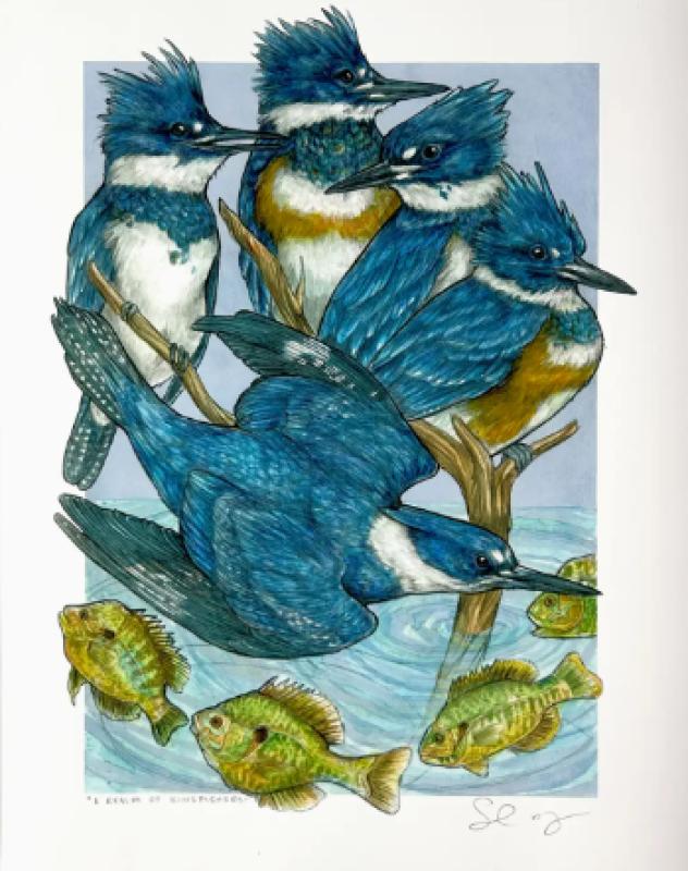 The collective noun for a group of belted kingfishers is a realm. These belted kingfishers are standing on a branch with sunfish gliding below. This is an archival print of an original watercolor, gouache, and pencil illustration. It's giclee printed with archival quality inks on 100% cotton rag matte paper. Each print is backed with a white board, info card, and clear sleeve.