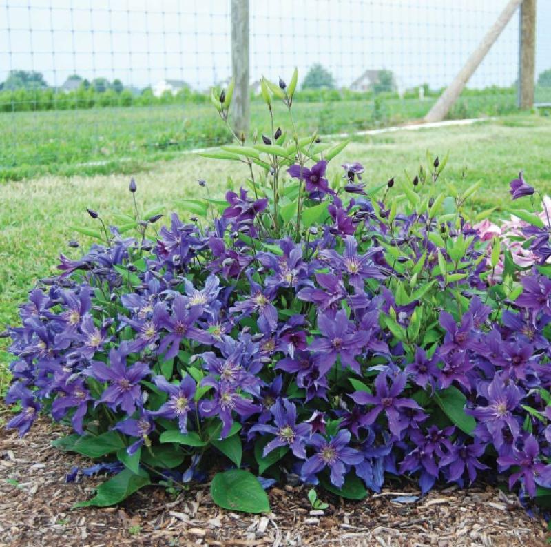 Rather than climbing straight up, these Clematis have a more upright, clump-forming habit. You may wish to provide support by pushing twiggy branches into the soil near the crown of the plant in early spring or placing grow-through supports (such as available for Peonies) around the crown. You may prefer to allow the plants to ramble onto neighboring plants or along the ground or stone walls.