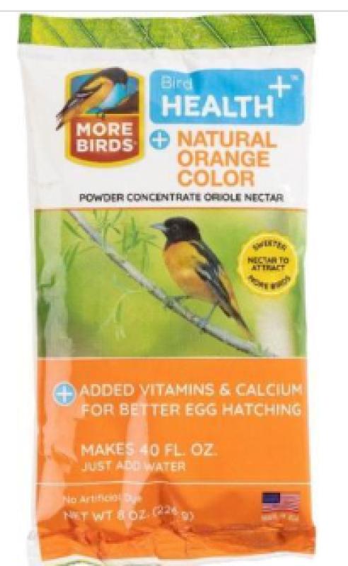 Now you can offer nectar to orioles without the fear of artificial dyes with More Birds Bird Health+ 8 oz. Natural Orange Powder Oriole Nectar Concentrate! Our nectar has no artificial dyes or flavors. Vitamins and calcium are added to promote successful egg hatching. More Bird s nectars are made from a blend of natural sugars found in flowers that birds feed from