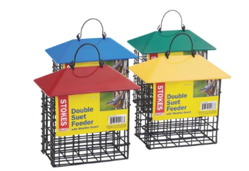 he More Birds Double Suet Feeder with Weather Guard is the perfect way to offer healthy treats to woodpeckers, nuthatches, chickadees and more! The cage holds 2 suet cakes and features an easy-open, double-locking closure system.
