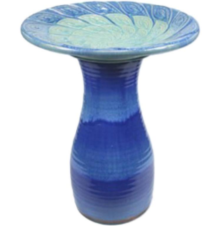 20"H Ceramic birdbath in dark blue and light green adds that perfect touch to any garden space. Bowl is 16" Dia.