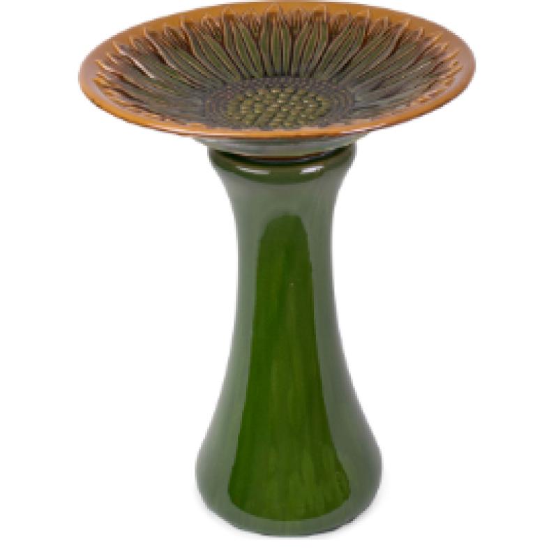Stunning ceramic birdbath with a green bowl with a sunflower design and yellow accents. These birdbaths feature a simple locking device, striking colors, and clean lines to accent your garden or yard.