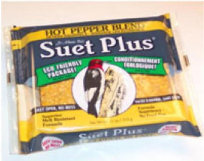 Suet Plus Hot Pepper Blend in the candy bar wrapper for Easy Open, No Mess handling. Pepper oil added to help deter squirrels. High quality, melt resistant suet blend in an envirnmentally friendly package. Suet Plus uses less packaging by weight than suet in a tray and is 100% recyclable. 5% frt west of Rockies Brick and Mortar.