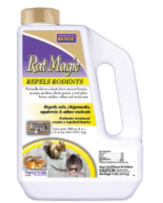 Rat Magic is designed for outdoor use to repel rodents such as rats, chipmunks and squirrels. This unique combination of essential oils is people and pet safe, and biodegradable. 5 lbs. treats up to 1000 sq. ft. or a 2 ft. barrier that's 500 ft. long.